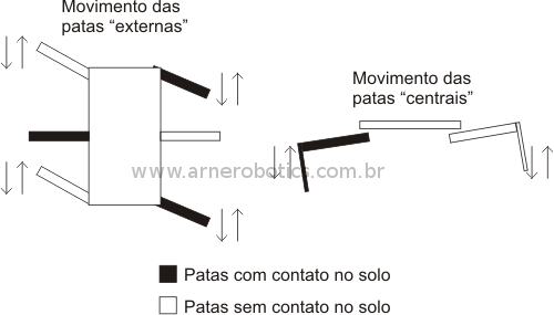 O "cérebro" do Robô Inseto é um microcontrolador Basic Step1 da Tato Equipamentos Eletrônicos. O programa foi desenvolvido em TBasic. Ele possui uma "antena" ligada a uma chave, que serve como sensor de contato. Sempre que o Robô Inseto encontrar um obstáculo ele desviará deste. Os led's são apenas para ajudar no "efeito visual", e indicam que o robô está executando um desvio. Tudo muito simples, mas funcional. COMO O ROBÔ SE MOVIMENTA Analisando a figura abaixo você perceberá que um dos servos atua levantando um dos lados do robô (patas centrais). Isso faz com que duas patas “externas” fiquem em contato com o solo e outras duas não. As duas patas em contato com o solo são controladas pou um outro servo que faz com que as mesmas movam-se para frente ou para trás.
